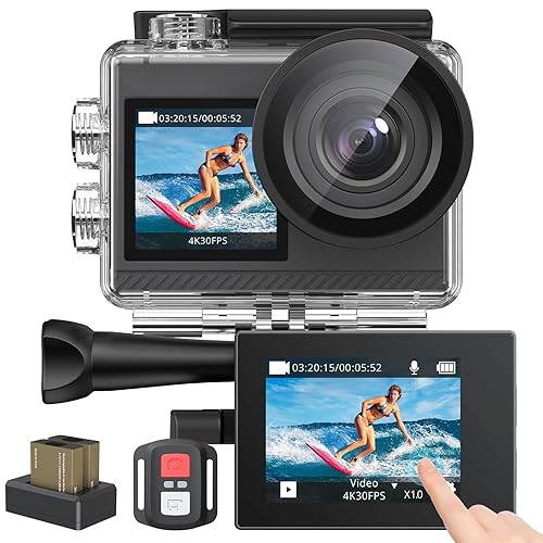 このアクションカメラは4K 20MPで、タッチパネル式のデュアルカラースクリーンを搭載。40M防水、水中でも使用可能。手ぶれ補正、外部マイク対応、WiFi、HDMI出力、5倍ズーム、リモコン付き。1350mAhのバッテリーが2つ付属し、170度の広角レンズを持つ豊富なアクセサリーもあります。