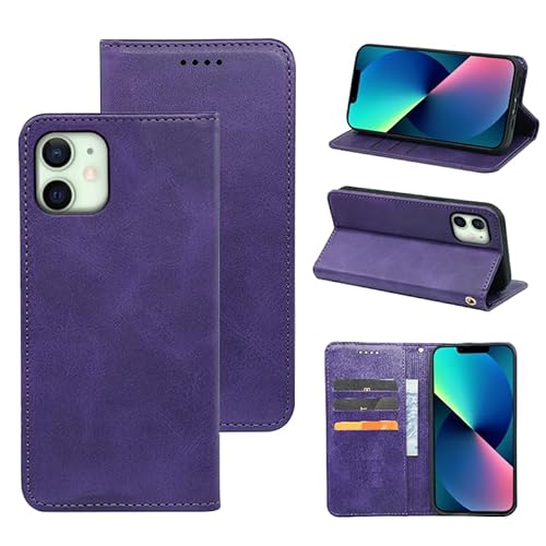 iPhone 12 mini用手帳型ケース。PUレザー製で耐衝撃性があり、カード収納機能付き。マグネットで閉じられ、スタンド機能も搭載。深い紫色が特徴。5色展開。