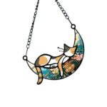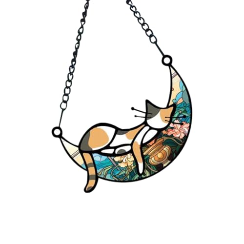 Rolin Rolyのガラスウィンドウペンダントは、月の上で眠る猫をデザインしたアクリル製のサンキャッチャー。手描きのステンドグラスパネルで、美しい装飾やギフトに最適です。