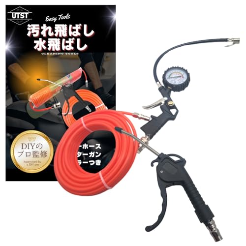 UTSTのエアーホースは、5mホース、ダスター、エアーゲージが付いており、エアー工具用に最適です。プロ監修の安心品質で、効率的な空気入れや清掃が可能です。