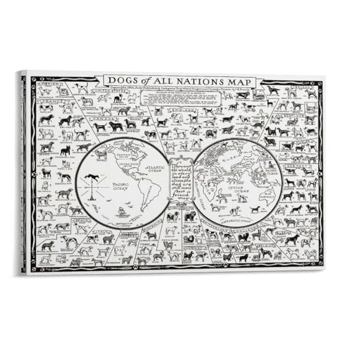 すべての国の犬を描いた世界地図アートポスター。サイズは12×18インチ(30x45cm)。キャンバス製で、壁にすぐに掛けられます。誕生日ギフトやホームアートに最適です。