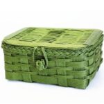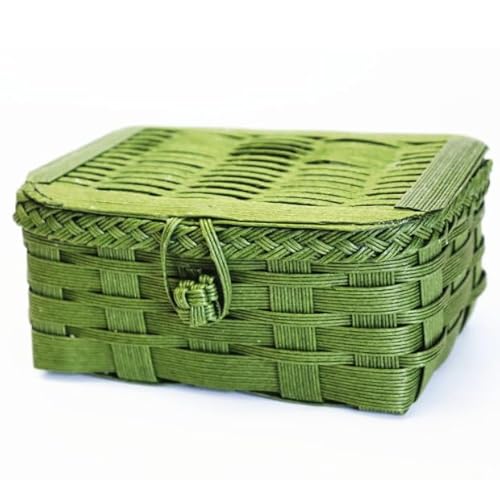 蓋つきのミニバスケット手作りキットです。紙バンドを使い、簡単に小物入れを作れます。抹茶色のデザインで、クラフトバンドがセットになっており、レシピ付きで手芸初心者にもおすすめです。