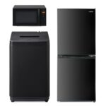 アイリスオーヤマの新生活セットは、6kg洗濯機、142L冷蔵庫、17Lレンジの3点セットです。全て黒色でスタイリッシュ。新生活をサポートする便利な家電が揃っています。