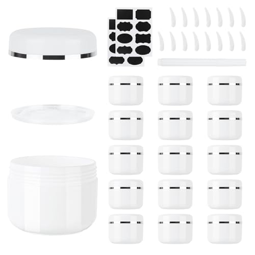 MirraSwit 50mlの化粧品サンプルジャー15個セット。詰め替え可能でトラベルポットとして便利。蓋付きで、へらやラベルペンも付属。メイクアップやネイルにも最適です。