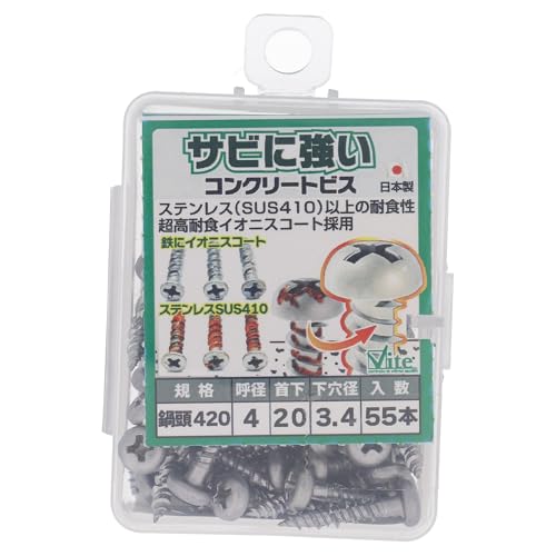 大里のサビに強いコンクリートビス、鍋頭4X20mm(55本入)は、高耐久性を誇り、コンクリートへの強力な固定が可能です。防錆処理が施され、長期間の使用にも適しています。