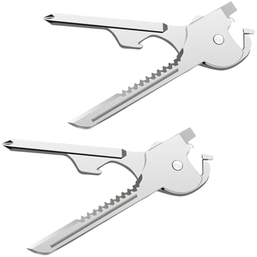 小型鍵型マルチツール。鍵型ナイフ、ドライバーなどが搭載された6-in-1仕様で、携帯に便利なキーホルダータイプ。登山やアウトドア、キャンプに最適。2個パック、シルバー色。