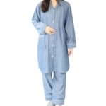 NISHIKIのマタニティパジャマは、長袖・綿100%で、前開き授乳口付き。春秋に最適なダブルガーゼ使用。肌に優しく、調整可能なウエストのロング丈パンツが特徴。サイズは薄ネイビーのM。