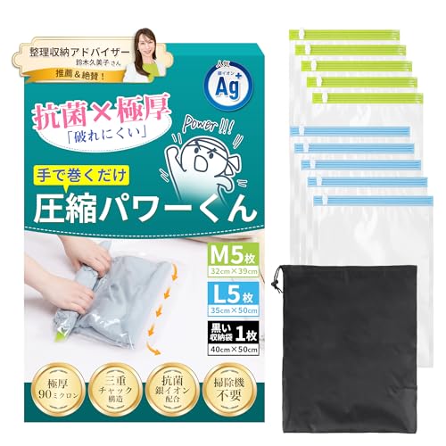 IKURASHIの圧縮袋は、5倍の防臭効果と7倍の強度を誇る極厚90ミクロン素材を使用。3重チャックで密封力UP、手巻き式で簡単に圧縮。大容量で繰り返し利用可能、出張や修学旅行にも最適。M5枚+L5枚、黒収納袋付き。