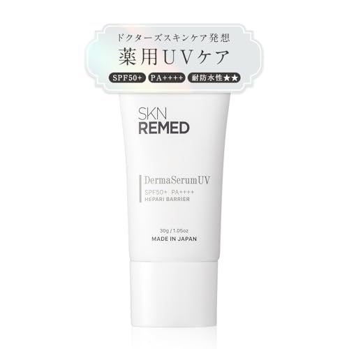 SKN REMED ダーマセラムUV ヘパリバリアは、SPF50+/PA++++のノンケミカル日焼け止めです。無添加で、ヒアルロン酸やセラミド配合の美容液として保湿効果もあり、 UVカットしながらスキンケアが可能です。