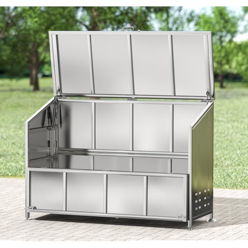 屋外用の大きなステンレス製ゴミステーション。カラスや野良猫、小動物によるゴミ荒らしを防止。高強度で、収集庫として最適。蓋付きで庭用、アジャスター付きで120cmのサイズ。