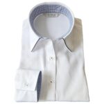 PARIS 16eのレディース長袖シャツは、オフィス向けの白いカッターシャツで、ビジネスシーンに最適。形態安定加工とブラックパイピングが特徴。サイズはM。