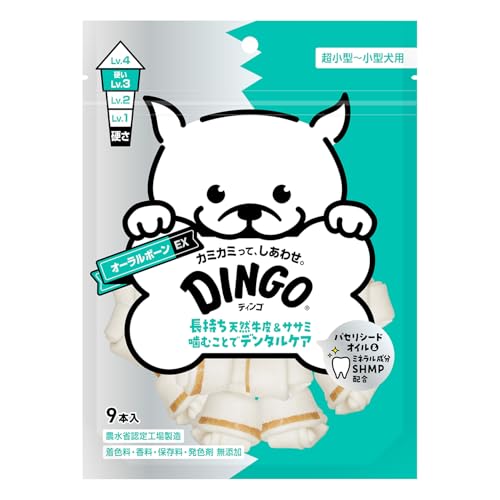ディンゴ オーラルボーンEX ミニは、牛皮の内側に肉を巻き込んだ犬用おやつです。長持ちするガムで、ストレス解消や噛み癖防止に役立ち、噛むことで歯の汚れや歯垢を落とします。9本入りです。