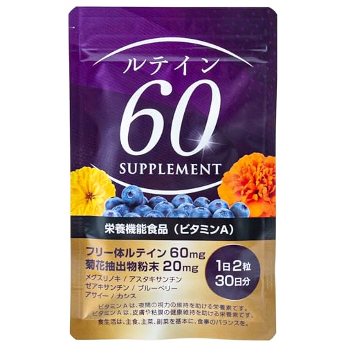 ルテイン60は30日分、60粒入りのサプリメントです。ルテインやゼアキサンチンに加え、ブルーベリー、アサイー、カシスを含み、栄養機能食品としてビタミンAや菊花エキスが配合されています。
