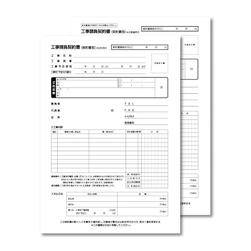 工事請負契約書 A4サイズ、2枚複写仕様。50組セットで提供。契約内容の明確化や法的保護に最適。各ページはしっかりした用紙を使用し、記入スペースを考慮した設計。業者間の信頼構築に寄与します。