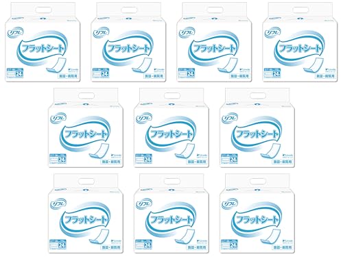 まとめ買いリフレの施設・病院用フラットシートは、24枚入で吸水シートです。吸収体はヨレ防止V字型押し加工されており、10パックでお得に提供しています。