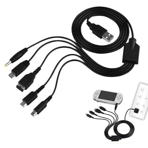 高耐久の5in1 USB充電ケーブル。ニンテンドー3DS、NDSL、SP、WIIU、PSPに対応。急速充電が可能で、断線防止設計。長さは1.2m、ブラックカラー。