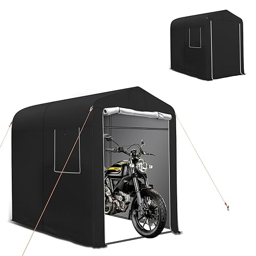 J-PREMIS サイクルハウス Sサイズは、バイクや自転車を最大2台収納できる高耐久炭素鋼チューブ製のガレージテントです。UV加工と撥水加工により、雨や紫外線から保護し、屋外での使用に最適です。サイズは幅200cm、奥行110cm、高さ180cm。