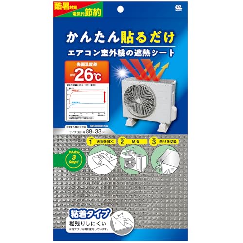 ワイズの貼るだけエアコン室外機遮熱シートは、約幅80×奥行33㎝で、簡単に設置でき、工具は不要です。アルミフィルム製で直射日光や雨、汚れから保護し、省エネ効果も期待できます。