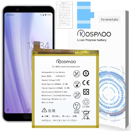 KOSPAOOのAQUOS sense3 plus/sense4 plus用バッテリーは、4000mAh、3.85V、HE391認証済み。PSE認証取得、600~800サイクルの高温・低温耐性あり。交換修理用で、機種対応はSH-M11/901SH/SHV46など。