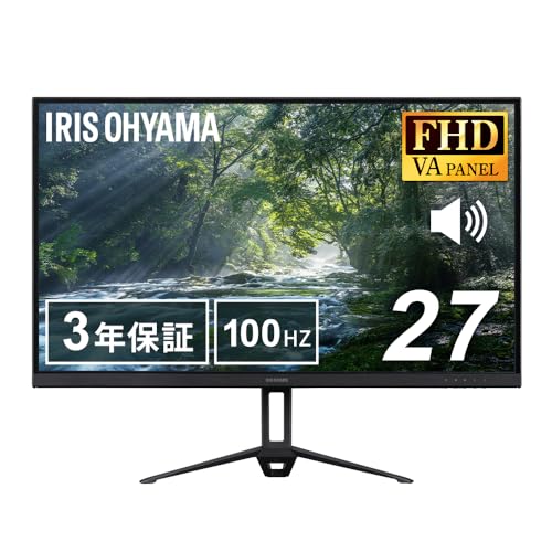 アイリスオーヤマの27インチモニターは、フルHD(1920×1080)、VAパネルを採用し、100Hzリフレッシュレート、スピーカー内蔵。フリッカー軽減機能で快適視聴。非光沢仕様で、HDMI接続対応。