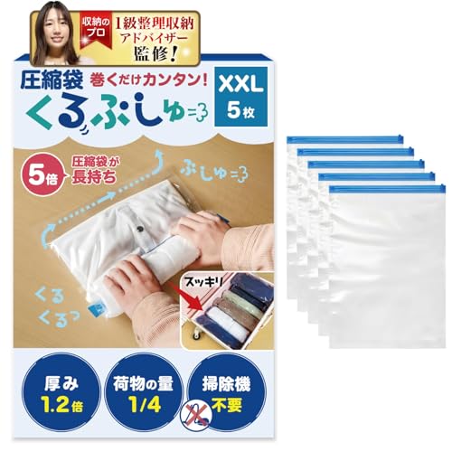 【1級整理収納アドバイザー監修】くるぷしゅの2025年版衣類圧縮袋(XXL 5枚)は、旅行や出張に最適な便利グッズ。圧縮効果でスペースを節約し、衣類を真空状態で保護します。