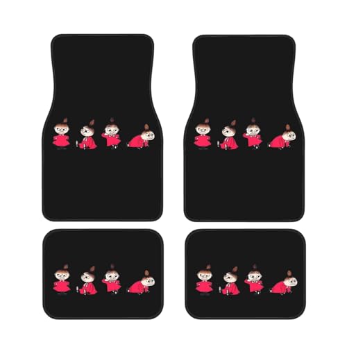 ムーミンデザインの軽/普通車フロアマット。防水・丸洗いOK、ズレ防止加工、滑り防止機能付き。耐汚れ仕様で、車種専用設計の簡単取り付け。フロント4枚組のカスタムマット、アニメグッズやプレゼントに最適。