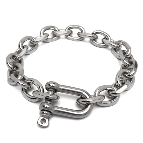 ステンレス製のチェーンブレスレット。シャックルデザインで4面カットが施され、存在感抜群。馬蹄モチーフと太幅で男性に最適。金アレ対応で安心して着用できます。