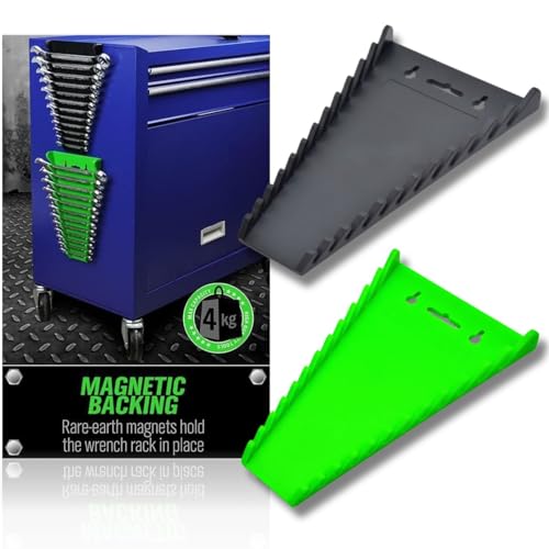 PRODIGY-ONEのレンチホルダーは、磁石付きで12本のレンチを収納可能。2個セットで、整理整頓が簡単にできます。壁掛けタイプで、グリーンとブラックのスタイリッシュなデザインです。