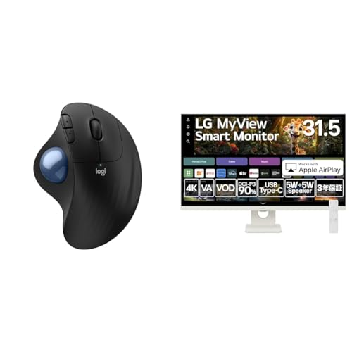 ロジクール静音ワイヤレストラックボールマウスM575SPDとLGスマートモニター32SR73U-Wのセット。M575SPDは快適な操作感、LGモニターは31.5インチの大画面でスマート機能搭載。