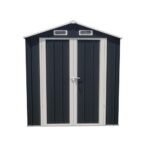 ブルーグレーの大型スチール戸外収納庫は、防水・耐侯性に優れ、広い収納スペースを提供。ガーデンや農場に最適で、引き戸デザインと補強フレーム付きで頑丈。