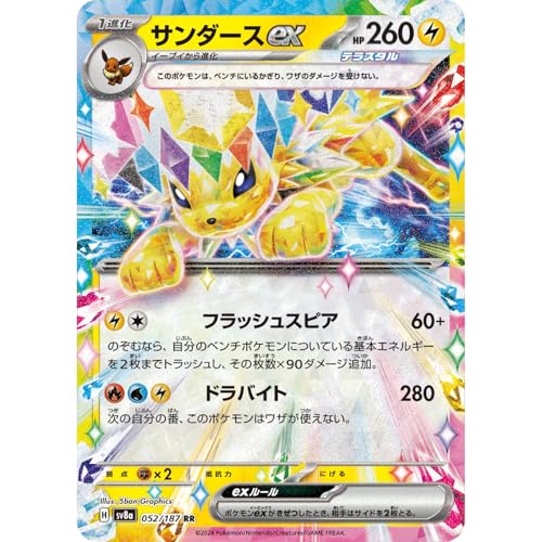 サンダースex 052/187(RR)テラスタルは、ポケットモンスターシリーズのカードで、特殊な能力を持つサンダースです。特有のテクニックで相手を圧倒し、魅力的なアートワークが特徴。