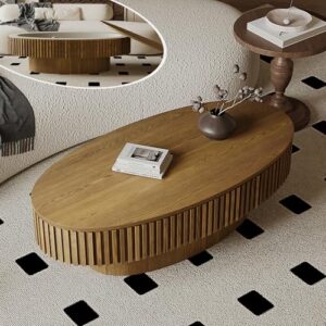 FGXJY 楕円形コーヒーテーブル 収納付き モダンなウォールナットコーヒーテーブル 無垢材ベニヤ付き 溝付きセンターテーブル 木製ドラムティーテーブル リビングルームアパート用 長さ47.2インチ x 幅23.6インチ x 高さ14.2インチ