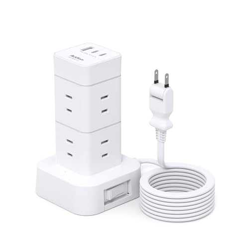 Addtam 電源タップ タワー 1m 延長コード【2025年 コンパクト版】は、8個のACコンセントと3つのUSBポートを搭載。コンセント一括スイッチ付きで、スマホ充電が簡単。雷ガード機能あり。ただし、PD非対応で急速充電は不可。