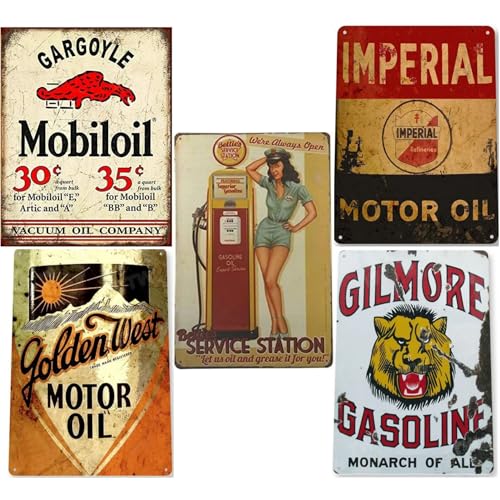 RYOHIN Lab.のブリキ看板5枚セット(タイプA)は、アメリカンレトロなデザインで、バイクや車のガレージに最適な壁掛けプレートです。アンティーク風の雑貨として、インテリアに彩りを加えます。
