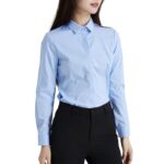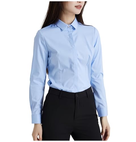 シャツ ブラウス レディースの長袖、隠しボタンデザイン。竹繊維を使用し、形態安定でノーアイロン。オフィスやカジュアルに最適。高通気性で春秋の日常にぴったり。サイズ:XL、色:ブルー。