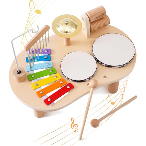 こどもドラムセットは木製のおもちゃで、鉄琴やチャイム、シンバル、ダブルギロを含む楽器セットです。3歳以上向けの知育玩具で、演奏家ごっこが楽しめる男の子、女の子向け。誕生日や入園祝いに最適!