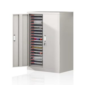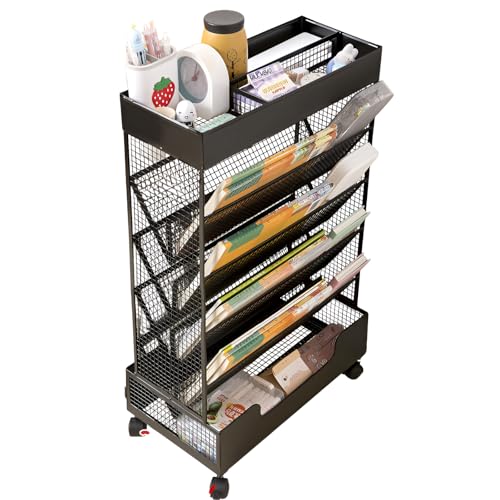 大容量の収納本棚。片面または両面使用可能で、キャスター付き。省スペースで6層のスリム設計。書類や雑誌、文房具を整理しやすく、オフィスや学校、教室に最適。サイズは68x41cm、組立簡単。