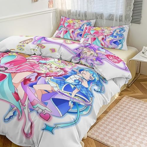 キミとアイドルプリキュアのシングルサイズ寝具セット。掛け布団カバー、ボックスシーツ、枕カバーの3点セット。起毛素材で抗菌、防静電効果あり。両面印刷デザインで、柔らかなタッチが快適な睡眠をサポートします。