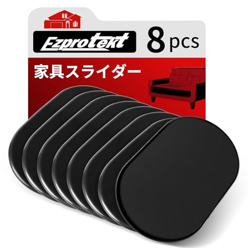 Ezprotektの家具スライダーは、240mm x 145mmのサイズで8個セット。滑りやすく、大型家具の移動を楽にし、傷防止や防音効果もあります。取れない設計で便利なブラックカラー。