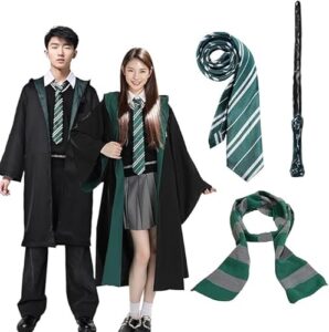[Formemory] ハロウィン コスチューム コンプリート ハロウィン コスプレ 衣装 ローブ ネクタイ スカーフ 魔法の杖(音を立てて光を放つ) 4点セット 緑 グリーン 道具 7つサイズ コスチューム ローブ 男女共用 ネクタイ コスプレ衣装 魔法の杖 (大人用, L)