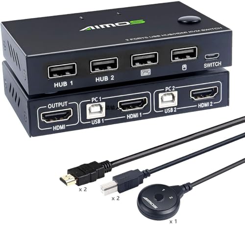 AIMOS USB切替器は4入力4出力で、マウスやキーボード、スキャナーなどを4PCで共有できます。ドライバー不要で簡単接続、手元スイッチ付きの便利な製品です。