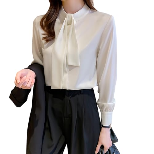 サテンボウタイブラウスは、リボン付きのエレガントな長袖とろみシャツ。オフィスカジュアルに最適で、ゆったりとした着心地。春秋冬に合わせやすく、着痩せ効果もあり、ビジネスシーンで活躍します。