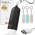 防犯ブザーは未使用で1年充電持続、Type-C充電対応。130dbの音量とLEDライト搭載で防犯対策に最適。防水仕様で小学生から大人まで対応、ランドセルや玄関にぴったり。留め具が改良され、使いやすさも向上。