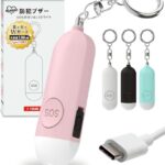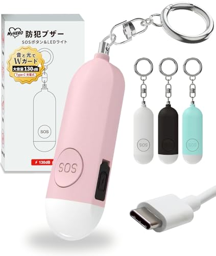 防犯ブザーは、未使用時でも充電が1年持続。Type-C充電で便利。130dbの音量とLEDライト機能付き、防水仕様。小学生から大人まで安心の防犯グッズです。