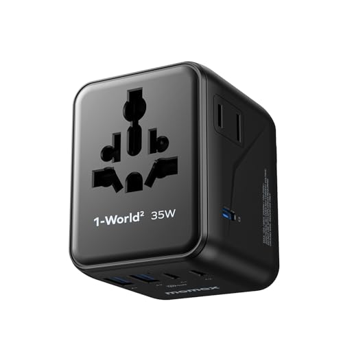MOMAX 変換プラグは35W PDで全世界対応、6台同時充電可能。3つのUSB-C PD、2つのUSB-A QC、1つのACコンセントを備え、150ヶ国で利用可能なマルチ変換プラグです。