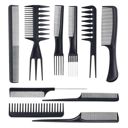 静電気防止機能付きのヘアケア用セットコーム10本セット。プロ用でメンズ・レディース問わず使用可能。シンプルなブラックデザインで、美髪スタイリングをサポートします。
