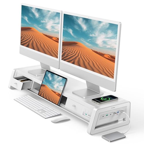 VAYDEERのデュアルモニタースタンドは、スマホ置き場、8つのUSBポート、2つの引き出し、LEDライトストリップを備えたデスクオーガナイザーで、PC/iMacに対応します。