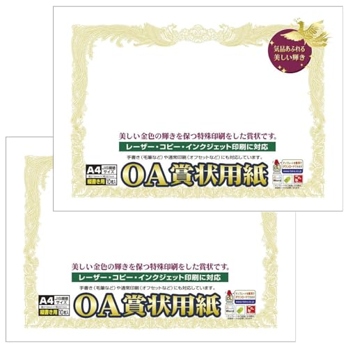 ササガワの賞状用紙は、タカ印のOA対応で縦書き用の白色A4サイズです。10枚入りが2セットで合計20枚。高品質な紙で、賞状作成に最適です。