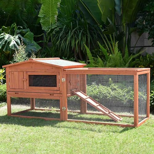 スライド式トレイ付きで清掃簡単な屋外用ウサギケージ。防水アスファルト屋根、スロープ、金網フェンス、ランケージ付きの2階建て木製鶏小屋で、安心して飼育できます。