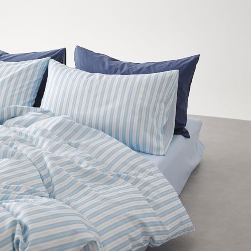 BUKAROOMのダブル4点セット寝具カバーは、100%綿製で掛け布団カバー(190x210cm)、ボックスシーツ、枕カバーを含みます。ストライプ柄でおしゃれなデザイン、ダブルジッパー式です。